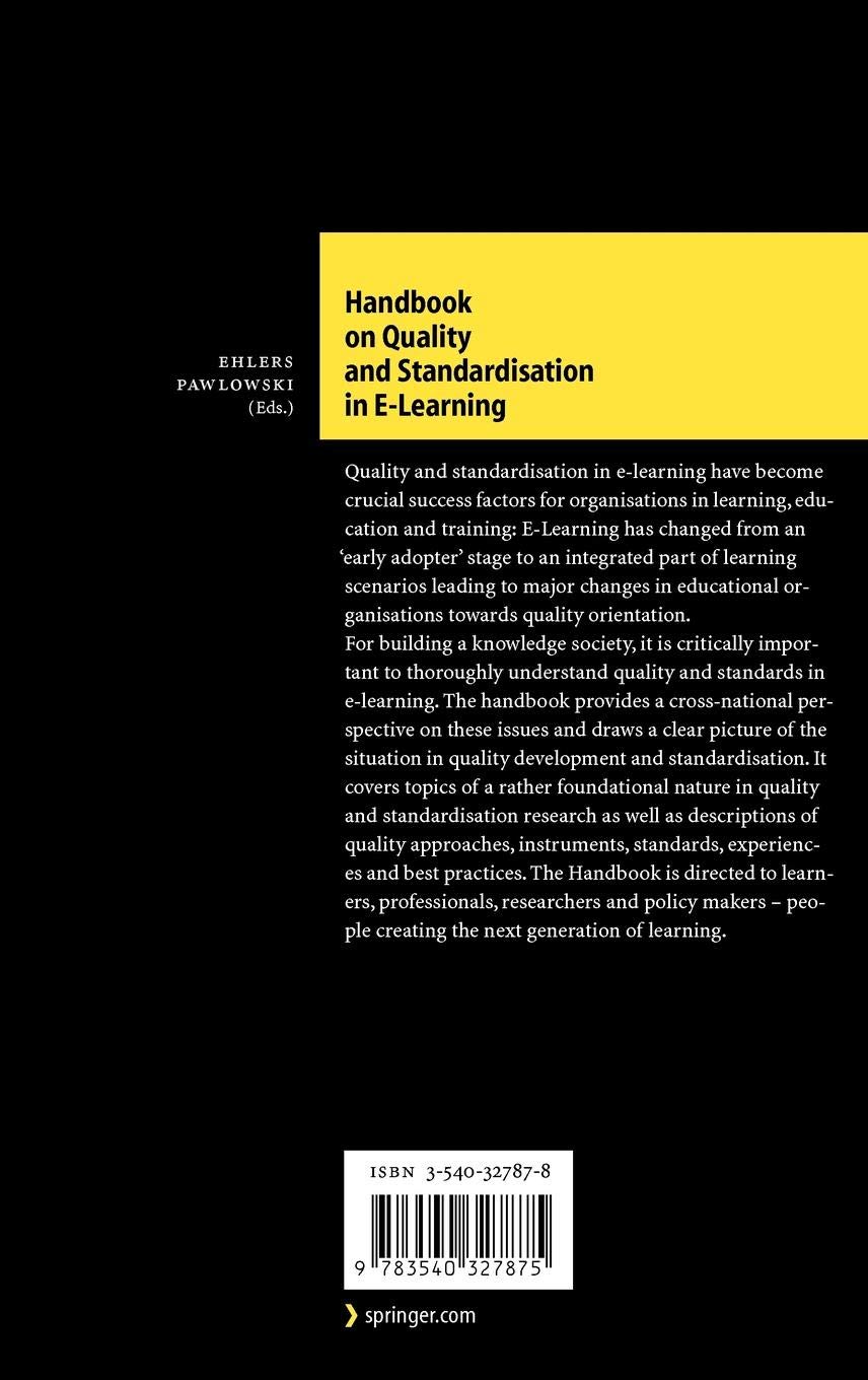 For building a knowledge society, it is critically important to thoroughly understand quality and standards in e-learning. The handbook provides a cross-national perspective on these issues and draws a clear picture of the situation in quality development and standardization. It gives a concise overview on the field of quality research which can be used for teaching purposes and contains examples of quality and standards and practice.